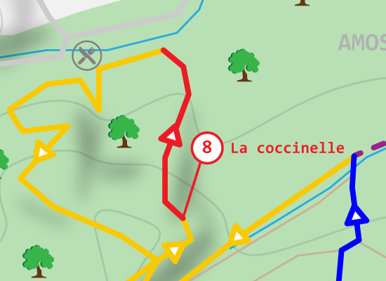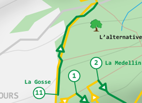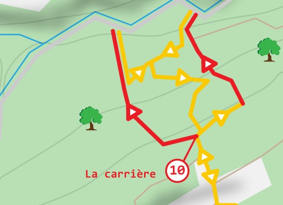 Après un enchaînement de plongeons dans des remblais de carrière, vous arriverez sur un petit drop semi naturel, suivi d’un enchaînement de petits plongeons et virages serrés. Vous terminerez par un slalom entre des arbres et quelques rochers.